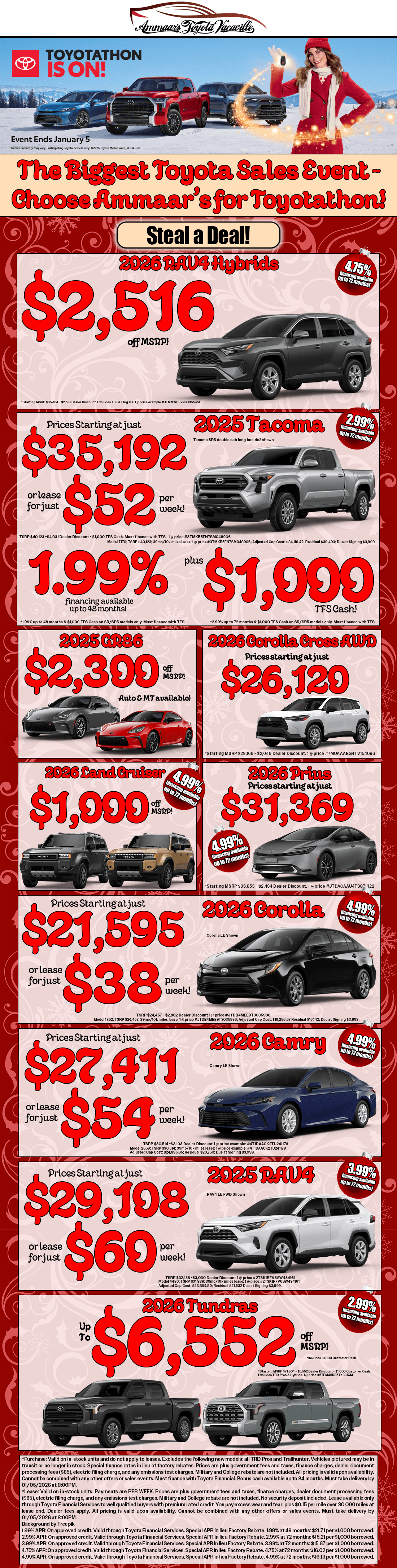 Who doesn’t like a good car advertisement? Maybe we aren’t an award-winning ad agency, but we sure are proud of what we offer – that’s why we create the ads. We want people to know what we have to offer here at Ammaar's Toyota Vacaville. If you don’t see one of our ads that you have seen run before, let us know.