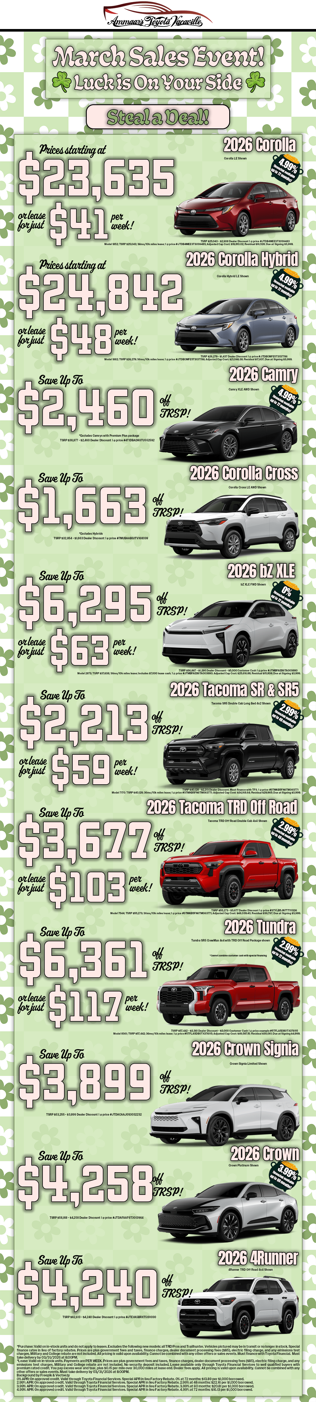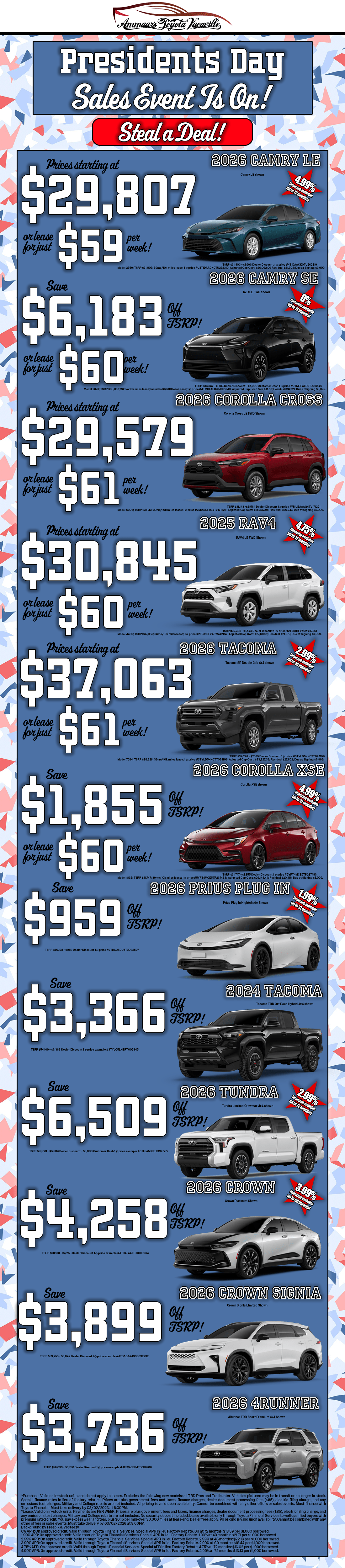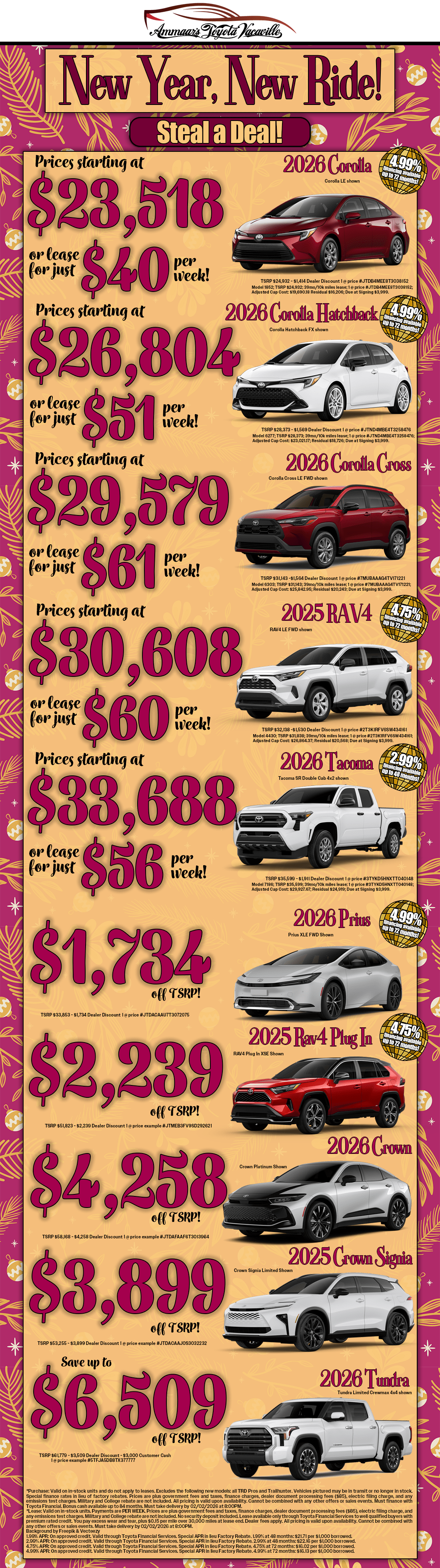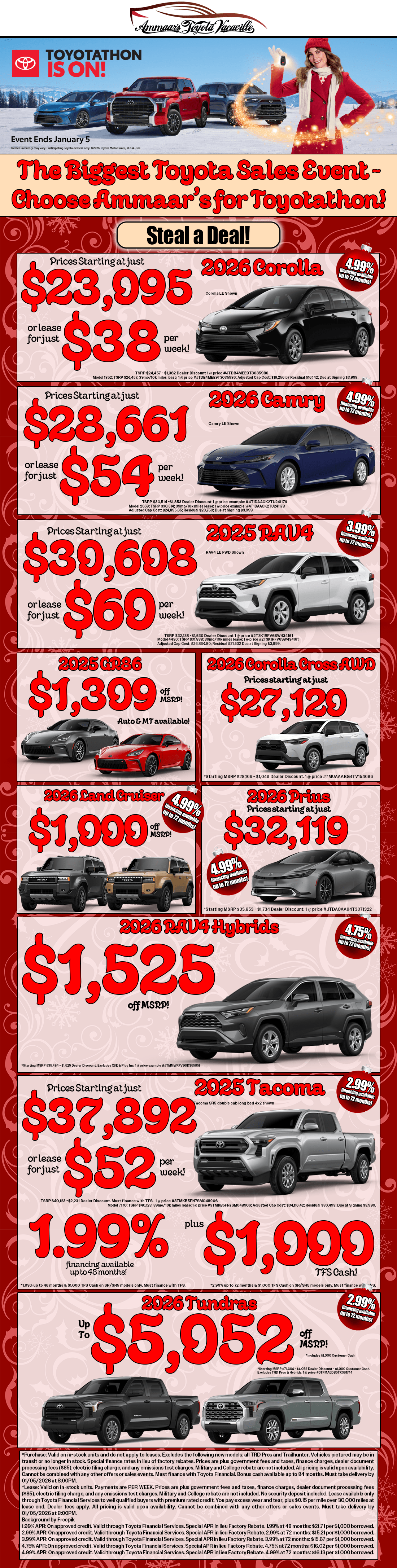 Who doesn’t like a good car advertisement? Maybe we aren’t an award-winning ad agency, but we sure are proud of what we offer – that’s why we create the ads. We want people to know what we have to offer here at Ammaar's Toyota Vacaville. If you don’t see one of our ads that you have seen run before, let us know.