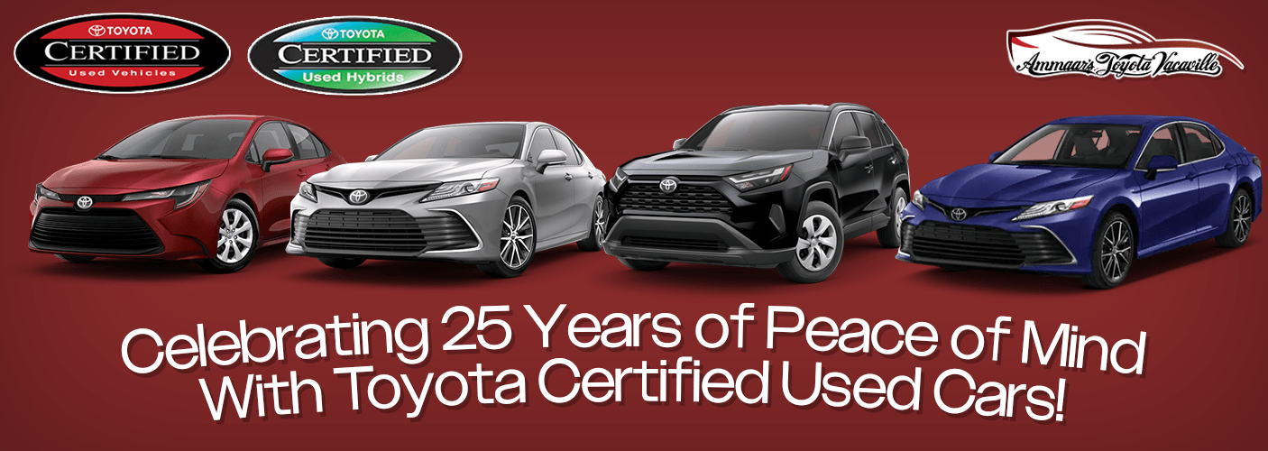 Since this year is the 25th anniversary for the Toyota Certified Used Vehicles (TCUV) program, our team at Toyota Vacaville would like to highlight our Toyota Certified Used Vehicle selection in Vacaville, CA. The TCUV program offers a wide range of benefits for car shoppers who desire a reliable used vehicle, and, over the last 25 years, Toyota has continued to improve the inspection process and perks included with the program.